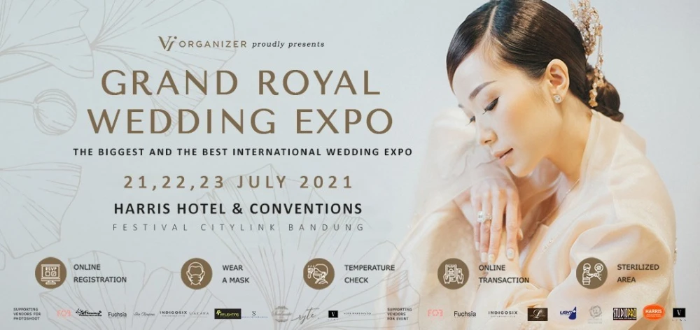 Bagi setiap orang pernikahan adalah hal yang diimpikan. Vendor pernikahan harus dapat memberikan pelayanan yang terbaik demi mendapatkan hasil positif dari para calon pengantin. Dengan waktu yang terbatas, akan sangat sulit bagi para calon pengantin untuk bertemu dengan berbagai macam vendor yang dapat mendukung acara pernikahannya. Grand Royal Wedding Expo Mid Year Sale (GRWE) hadir untuk menjembatani para vendor pernikahan dengan para calon pengantin. GRWE telah sukses diadakan sejak tahun 2017 serta mendapat respon yang luar biasa dari masyarakat. Respon tersebut dapat dilihat dari meningkatnya minat para vendor untuk mengikuti GRWE setiap tahunnya juga tingginya jumlah transaksi para calon pengantin di pameran-pameran sebelumnya. Terdapat paling tidak 200 vendor pernikahan yang ikut berpartisipasi di setiap pameran dan pengunjung yang datang mencapai 3000-4000 orang per harinya. GRWE 2021 akan diselenggarakan di Kota Bandung, tepatnya di Harris Hotel & Conventions Festival Citylink Bandung pada tanggal 21, 22, 23 Juli 2021 yang jatuh pada hari Rabu, Kamis, dan Jumat. Pameran ini merupakan pameran tahun ke-14 yang diselenggarakan oleh Vi Organizer di kota Bandung. ------------------------------------------------------------------------------------------------------------------------------------------------------------------------------------------------- Sebagai bentuk tanggung jawab kami untuk menjaga kesehatan & keselamatan seluruh pengunjung area expo di masa pandemi COVID-19, pada pameran kali ini kami menerapkan protokol kesehatan dengan ketentuan sebagai berikut: 1. Setiap pengunjung (tenant / calon pengantin) yang memasuki area expo wajib menggunakan masker medis / masker kain / masker KN-95 / masker N-95 Pihak panitia menyediakan masker medis seharga Rp 5.000,- /pcs bagi pengunjung area expo yang tidak membawa masker yang sesuai dengan ketentuan point No.1 2. Memasang alat pendeteksi suhu di jalur masuk area expo Temperature maksimum pengunjung area expo adalah 37,2 derajat Celcius. apabila suhu tubuh melebihi batas yang ditentukan, maka pihak Harris Hotel tidak akan memperbolehkan pengunjung memasuki area expo 3. Melakukan penyemprotan disinfektan pada pagi hari Pk 08.00 dan Pk 15.00 selama periode expo berlangsung 4. Transaksi antar client & vendor diwajibkan Cashless (Transfer / Scan QR / Debit) 5. Setiap tenant diwajibkan untuk menyediakan hand sanitizer 6. Anak dibawah usia 12 tahun & wanita hamil dilarang memasuki area expo 7. Maksimal jumlah pengunjung di area expo adalah 1.500 orang SYARAT & KETENTUAN 1. Setiap pengunjung WAJIB menunjukan e-ticket untuk memasuki area expo 2. Satu email hanya dapat digunakan untuk membeli 2 e-ticket 3. Pemesanan e-ticket hanya berlaku untuk masuk sesuai dengan hari dan tanggal yang dipesan. 4. Poin untuk doorprize / cashback akan terakumulasi hanya pada nomor handphone yang dicantumkan pada saat pembelian e-ticket. Pastikan anda membawa handphone dengan nomor yang dicantumkan pada saat pembelien e-ticket untuk mendapatkan SMS kode OTP ke nomor yang didaftarkan untuk melakukan redeem poin
