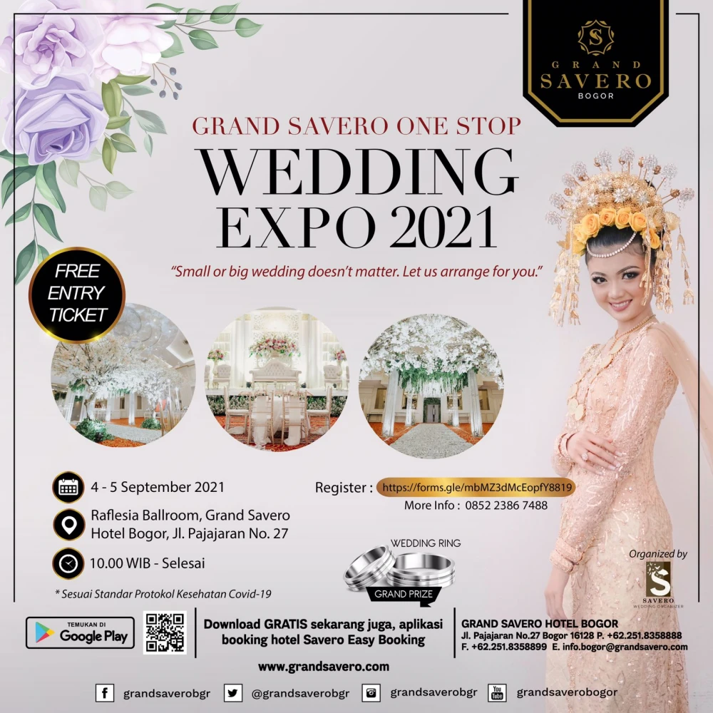 Batasi penyebaran Covid-19, pemerintah kembali memberlakukan pembatasan kegiatan atau yang biasa disebut PPKM (Pemberlakuan Pembatasan Kegiatan Masyarakat) dan aturan Ganjil Genap dibeberapa daerah termasuk daerah Bogor. Menyikapi situasi ini, kami Grand Savero Hotel Bogor menginformasikan bahwa event GRAND SAVERO ONE STOP WEDDING EXPO 2021 yang awalnya akan diselenggarakan pada 4 -5 September 2021 kini RESMI DITUNDA. Event ini Ditunda Sampai Batas Waktu Yang Belum Ditentukan untuk tahu lebih lanjut. Informasi 0852 2386 7488 —————————————— Grand Savero Hotel Jalan Padjajaran No. 27 Bogor Phone : +62 251 835 8888 WhatsApp : +62 878 9778 8543